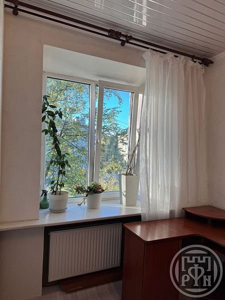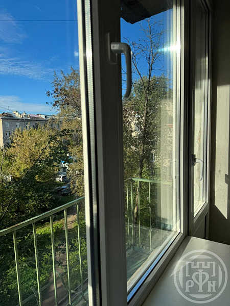 Широкие подоконники по индивидуальному заказу, окна и балкон выходят во двор, много зелени, никакого шума машин.