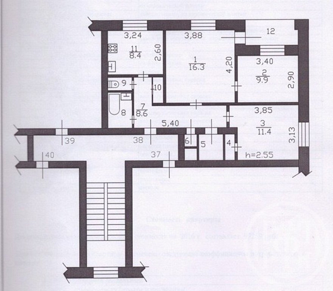 Комнаты смежно-изолированы (16,3 кв.м., 9,9 кв.м и 11,4 кв.м.), кухня - 8,4 кв. м.