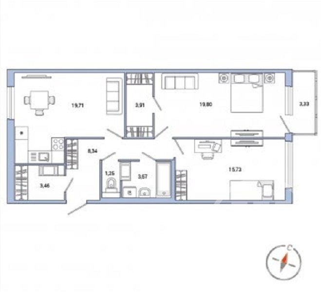 Очень удобная планировка квартиры, которая позволяет собраться всей семьей в уютной кухне-гостиной площадью 19,7 кв м. Эффективная планировка позволяет использовать каждый метр по назначению. Четкое разделение, большая площадь кухни-гостиной, две уютные спальни 19,8 со своей гардеробной 3,9 кв.м. и с выходом на балкон 3,3 кв.м., который будет служить Вам отличным местом для релаксации и уединения и вторая не менее уютная спальня 15,73 кв.м.