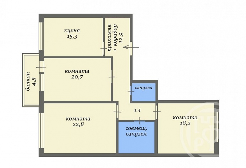 Кухня — 16, прихожая — 12,9, ванная — 7, санузел — 1,5.