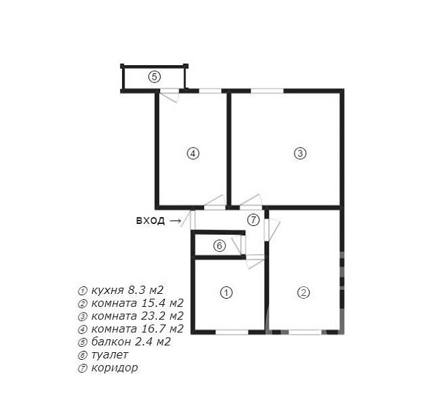 Площадь квартиры составляет 70,4 м². Комнаты изолированные: 23,2м²; 16,7м²; 15,4м². Кухня - 8,3 м². В кухонной зоне размещена душевая кабина. Окна квартиры выходят на две стороны. Есть балкон. Состояние квартиры позволяет заехать и жить.