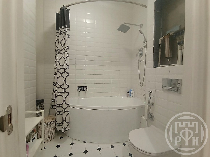 В санузле произведена коллекторная разводка, теплый пол, установлены фильтры и накопительный водонагреватель.