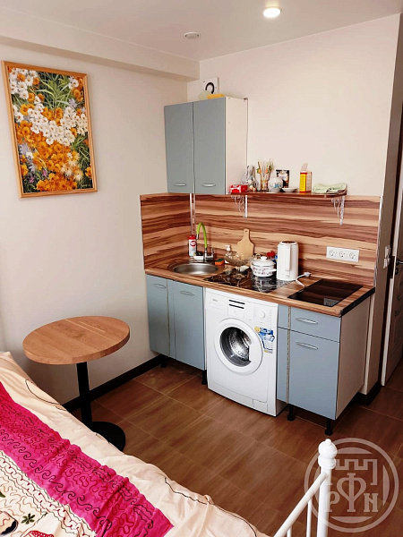 В студии оборудована кухонная зона, встроенная кухня, есть свой сан.узел с душем.