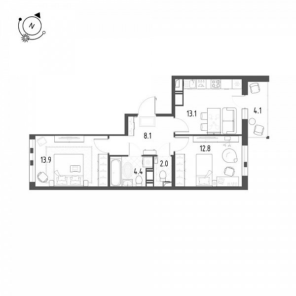Продается уютная 2х комнатная квартира ( 3Е) , где 2 полноценные комнаты + кухня-гостинная, в современном жилом комплексе ЖК Монография . 58,1 м2