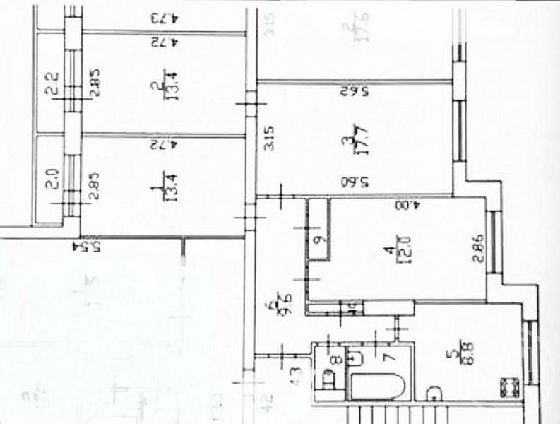 - на запад - кухня (8.8 кв.м), комната1 (12.0 кв.м) и комната2 (17.7 кв.м);
