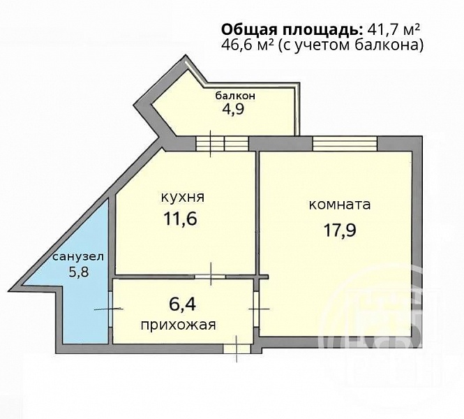 Общая площадь — 41,7 кв. м. Жилая — 17,9. Кухня — 11,6. Прихожая — 6,4. Ванная — 5,8. Санузел совмещённый.