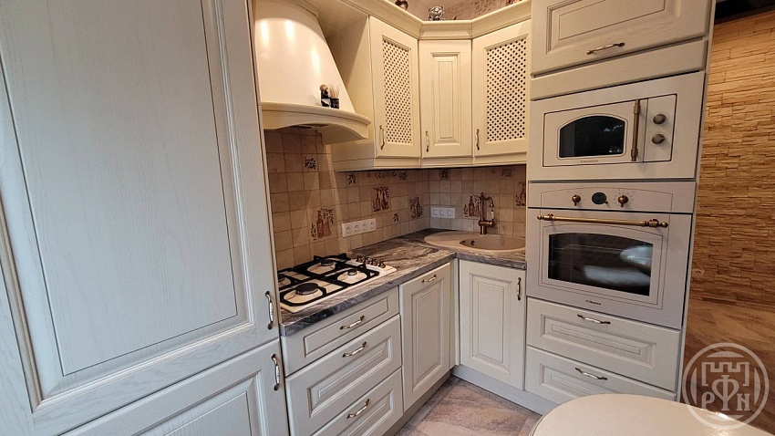 В квартире остается вся мебель, кухонный гарнитур с встроенной техникой (холодильник, духовой шкаф, варочная панель, микроволновая печь), стиральная машина.