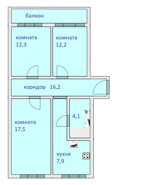 Общая площадь 70,2 кв.м. Изолированные комнаты.