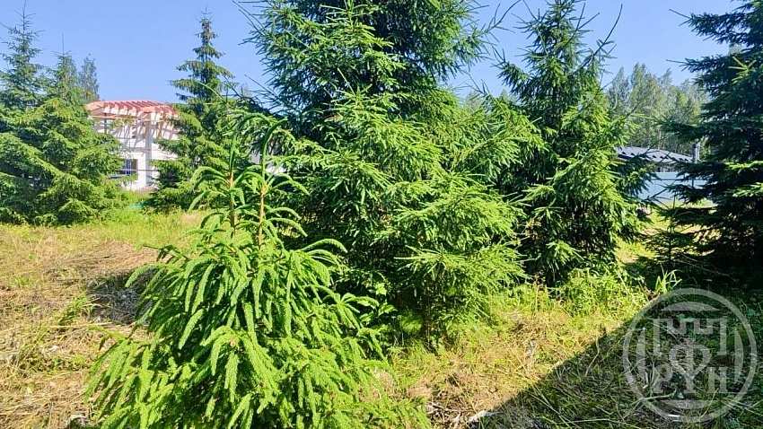 Участок ровный, правильной формы и украшает его 10 небольших елей.
