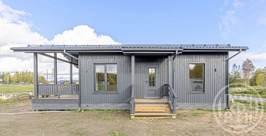 В новом коттеджном поселке комфорт-класса в п. Уткино Выборгского района, на стыке двух красивых озер Подгорное и Красногвардейское, продается новый современный зимний дом. Он одноэтажный, возведенный по каркасной технологии из высококачественных материалов, имеет размеры 8х13 м и общую площадь 91 кв. м. В его планировку входят тамбур, прихожая, санузел, две спальни по 9,7 кв. м каждая, кухня-гостиная площадью 24 кв. м и открытая терраса размером 30 кв. м. Дом полностью готов к проживанию. Внутренняя отделка выполнена из карельской сосновой доски, покрытой огнеупорным покрытием, пол из ламината, в санузле керамическая плитка. Внешняя отделка – из имитатора бруса, окрашенного атмосферостойкими красками. Террасная доска из лиственных пород. Сделаны ливневки, система снегозадержания, водопровод защищен от промерзания греющим кабелем. В доме проведены электричество (15 кВт), вода из центральной скважины, организовано отопление с помощью теплых полов и электрокотла, а также установлена канализация на основе финской биостанции. Высокие потолки и панорамные окна в гостиной создают ощущение простора и уюта. Из гостиной есть выход на террасу. Участок солнечный, ровный и сухой, с естественным дренажем. Его подготовили: раскорчевали, разработали, отсыпали чернозёмом. Есть удобный широкий заезд и место для парковки двух автомобилей. Магистральный газ подведён прямо на участок. Посёлок полностью огорожен и охраняется. На въезде — шлагбаум и КПП. Для детей и взрослых предусмотрены общие площадки: детская и спортивная. Дороги в поселке широкие и сухие. Вокруг — живописные леса, свежий воздух. До Выборгского шоссе всего 5 км, до курортного Зеленогорска — 28 км.