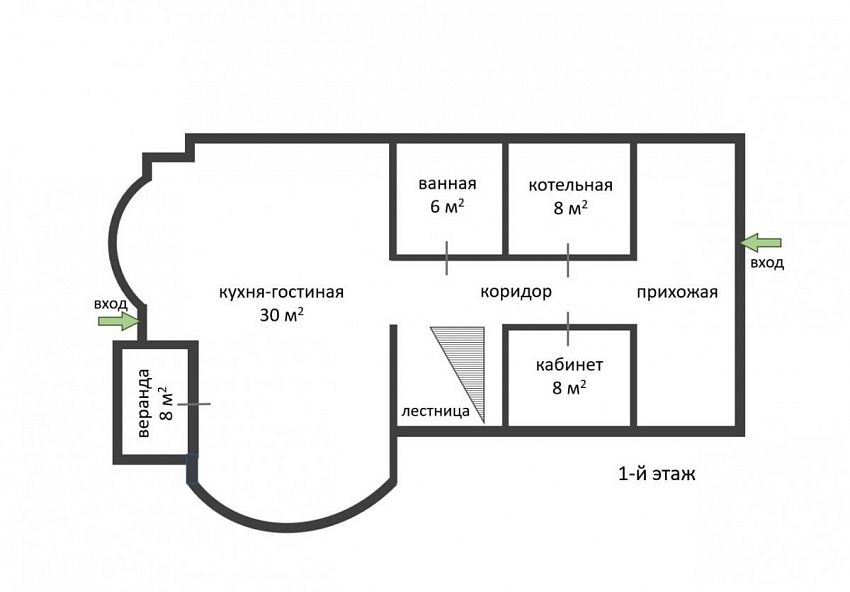 Первый этаж: кухня-гостиная 38 кв.м с камином установленном на подушке., СУ с окном и ванной, бойлерная с душевой лейкой для набора воды и уходом за собаками, мастерская (можно использовать как небольшую комнату), прихожая.