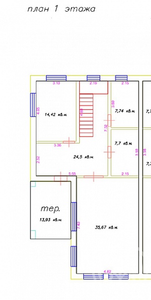 1 этаж: просторная прихожая, гардеробная, оборудованная котельная, большой совмещенный санузел, гостевая комната, кухня- гостиная с выходом на террасу.