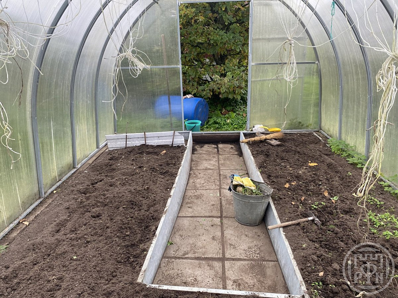 Земельный участок правильной формы площадью 11,6 соток находится в собственности и размежеван. На нём расположены парник и колодец с четырьмя кольцами. Забор представляет собой сочетание сетки рабицы и металлического профиля, с воротами и удобным заездом для автомобиля.