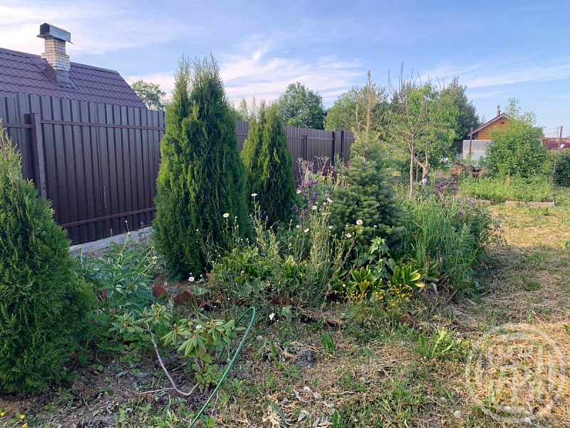 На участке много хвойных растений, в том числе туи, можжевельники, сосны, а также цветов, плодово-ягодных кустарников и деревьев. Есть теплица и маленький парник.