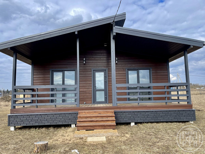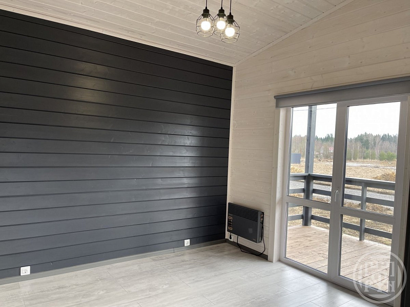 Отделка имитация бруса, качественный ламинат, в санузле кварцвинил, трехкамерные энергосберегающие панорамные окна, установлены сантехника, освещение, межкомнатные двери, окрашенная краской Тиккурила, крыша – металлочерепица