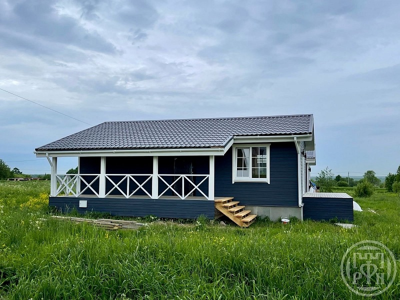 Дом обшит имитацией бруса и покрашен снаружи. Сделаны перилла на террасе.