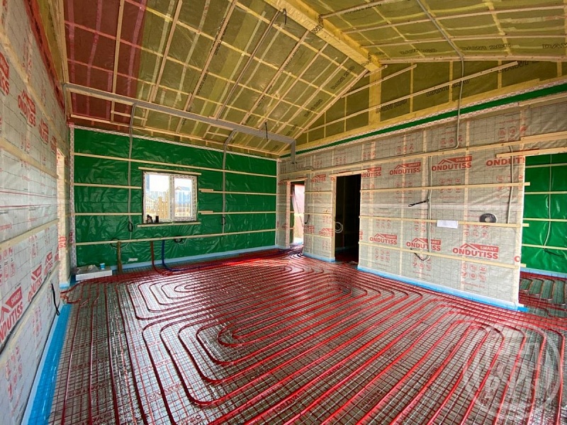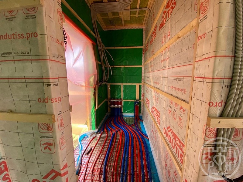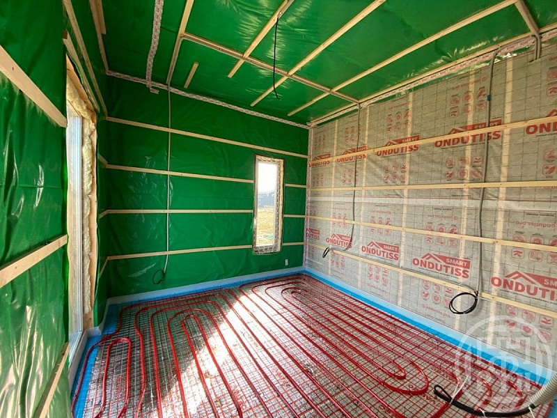 Водяной тёплый пол, сухая стяжка. Розетки, выключатели, светильники, водорозетки по проекту.
