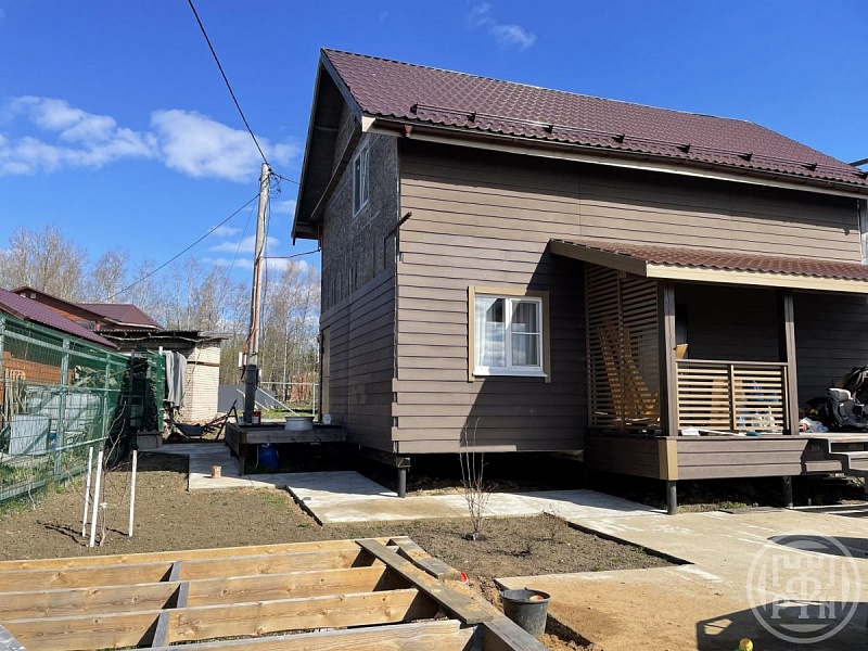 Дом построен по каркасной технологии, фундамент- железобетонные винтовые сваи.