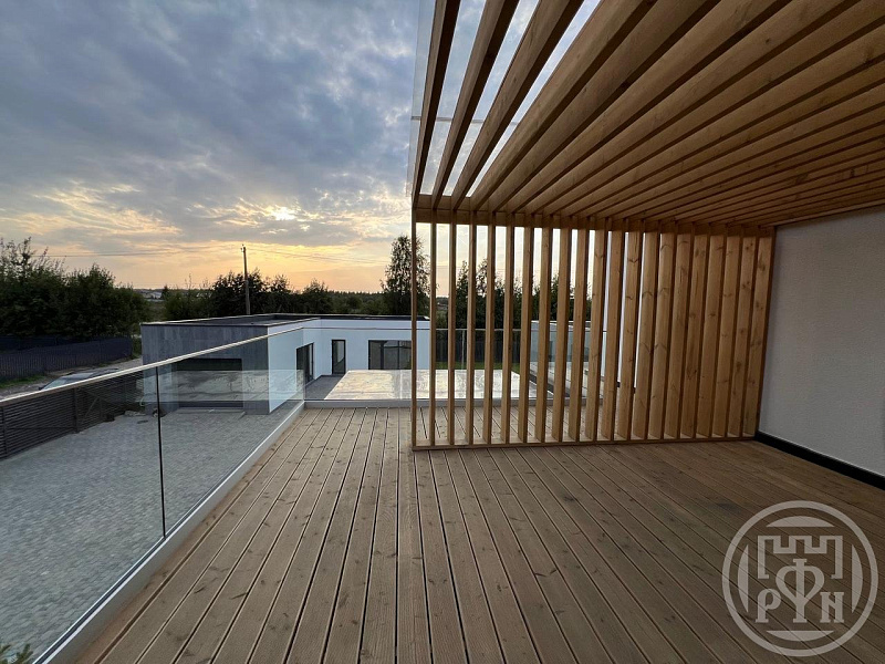 - полы на террасе- керамогранит, на балконе-террасная доска, стеклянное ограждение.