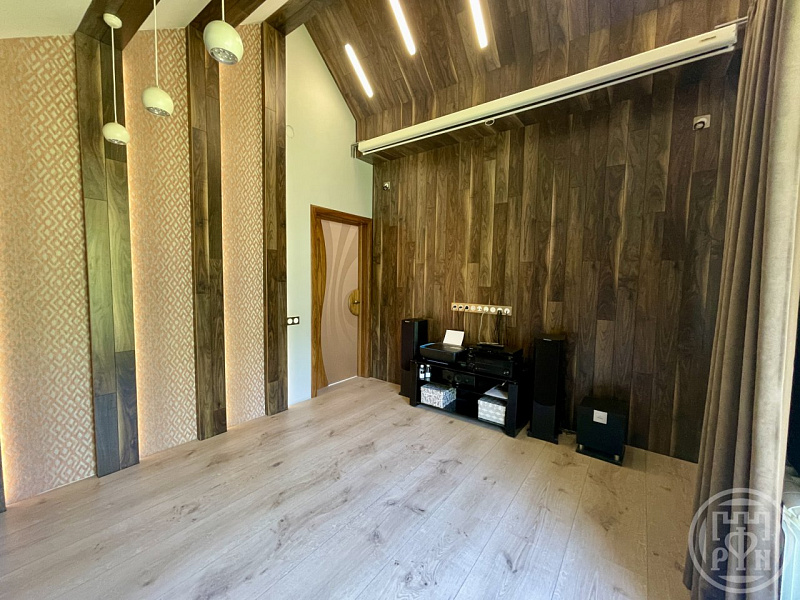 Второй этаж включает лестничный холл, три спальни с мансардными окнами и гардеробными, домашний кинотеатр, кабинет, кладовую и санузел.