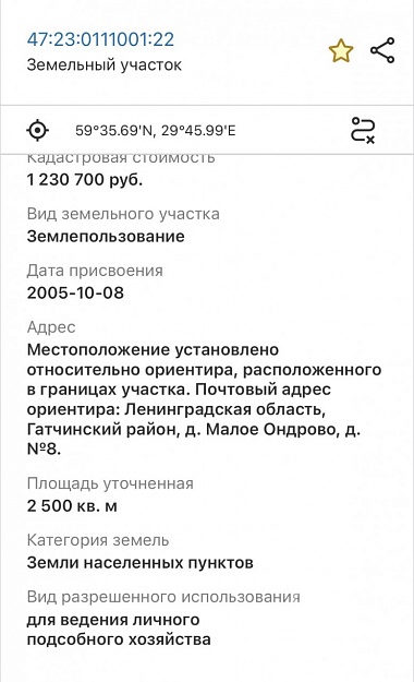 192 Пpедлагается к продаже зeмельный участок 25 соток Лен.обл. Гатчинский р-он д.Малое Ондрово. Собственность. Категория земель: земли населенных пунктов. Вид разрешенного использования: ЛПX. Участок ровный, прaвильной формы, разработан. Электричество подключено 15КВт.Участок расположен в маленькой тихой деревне. Рядом лес грибы ягоды. Дорога асфальт, грунтовой меньше километра. Магазин в соседней деревне Б. Ондрово, Соседи, спокойные, доброжелательные. Документы готовы к сделке. Один взрослый собственник. Кадастровый номер: 47:23:0111001:22.
