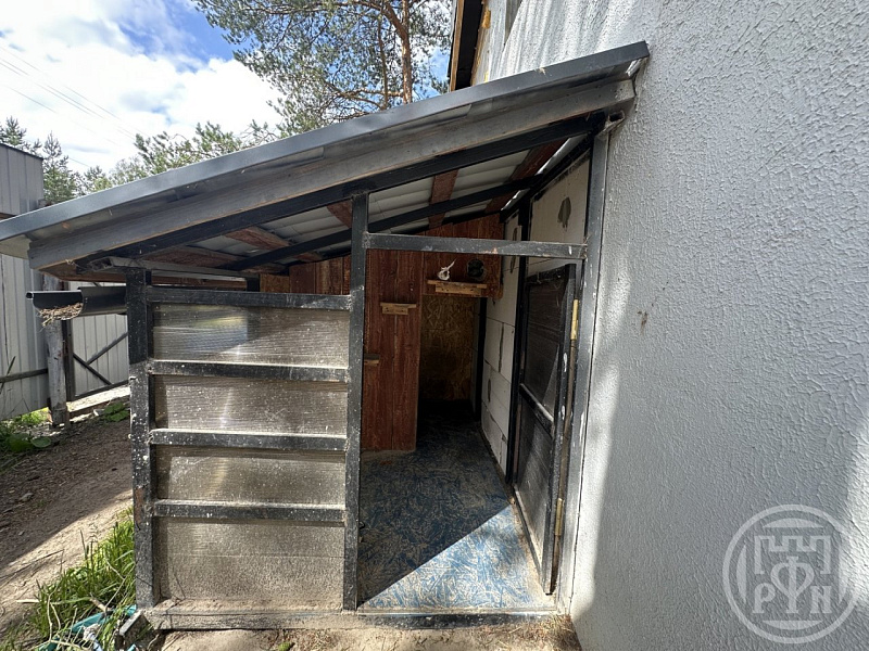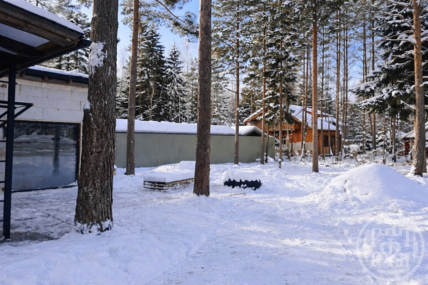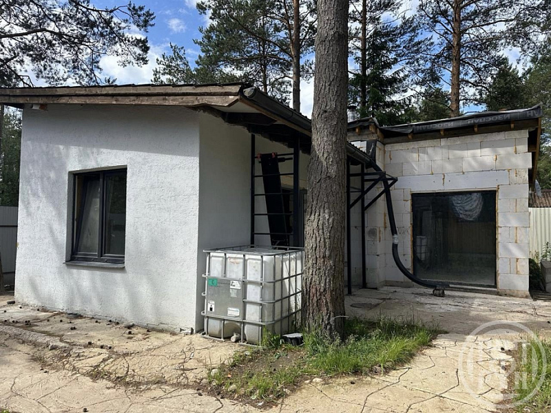 Участок — 944 м² в окружении вековых сосен, с вымощенными дорожками и местом под строительство второго, большого дома (10×10 м).