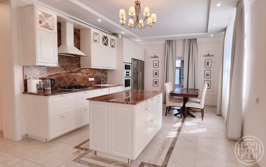 Большая кухня-гостиная место времяпровождения всей семьи, здесь можно собраться за ужином, отдохнуть и обсудить текущие дела в мягких креслах у камина, насладиться тишиной или поиграть с детьми днём.