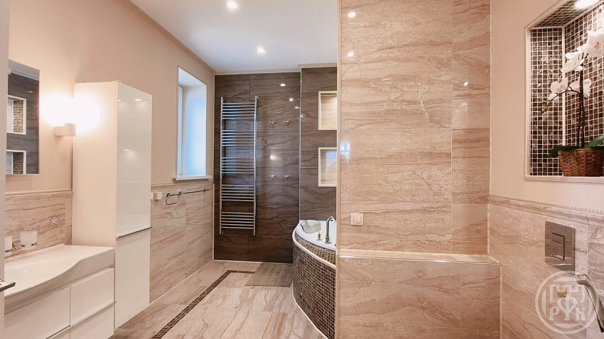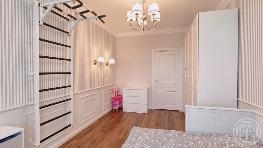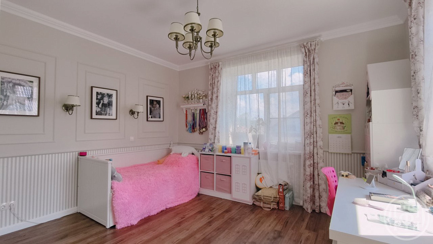 Три спальни и большая ванная комната на втором этаже. Гостевая комната или при необходимости кабинет, на первом, отдельная гардеробная, сан. узел, бытовые помещения.