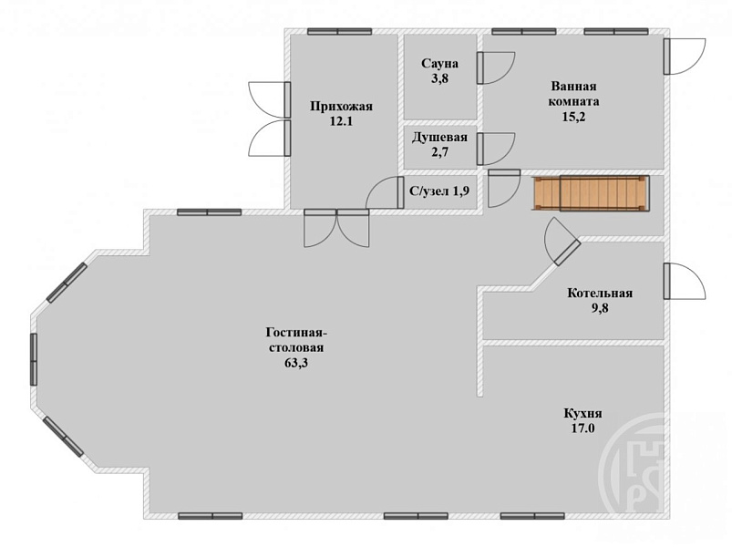 На первом этаже: Кухня-гостиная общей площадью 80кв.м (она является изюминкой 1 этажа, с удобной диванной группой, где можно проводить уютные семейные вечера или шумные мероприятия), сауна, ванная c джакузи, СУ, котельная, а также веранда с выходом в сад.