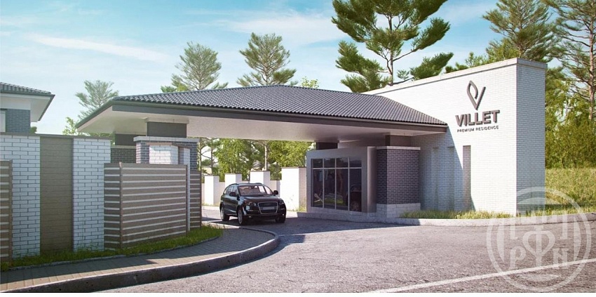 В поселке запланирована входная группа с двумя охраняемыми въездами. Проект въезда на фото.