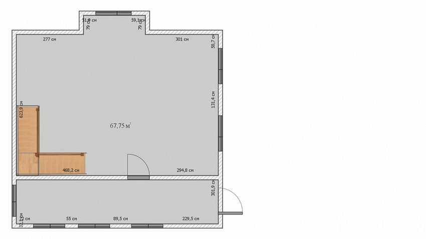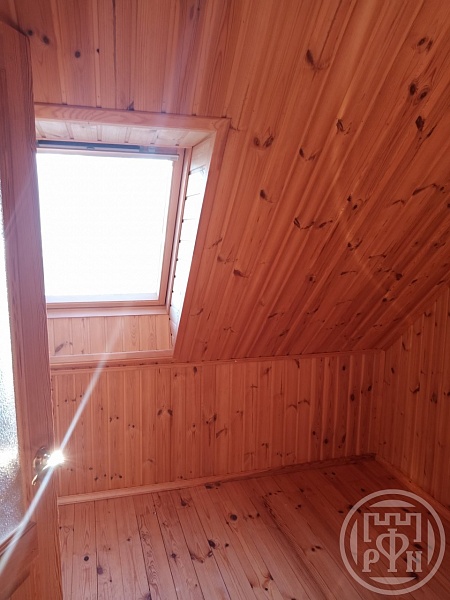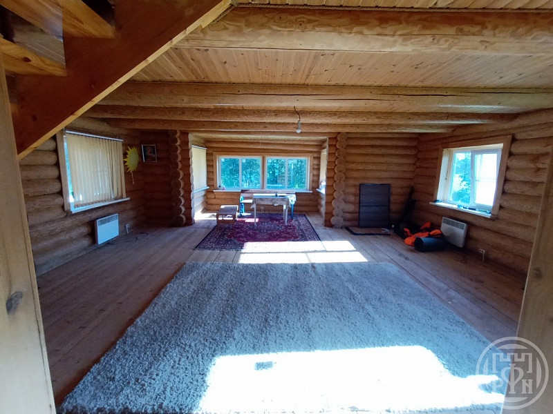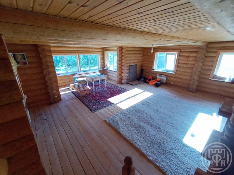 На первом этаже коридор и огромная комната с четырьмя окнами, что позволяет разделить комнату на несколько зон, есть фундамент под печку, сухой подвал в полный рост.