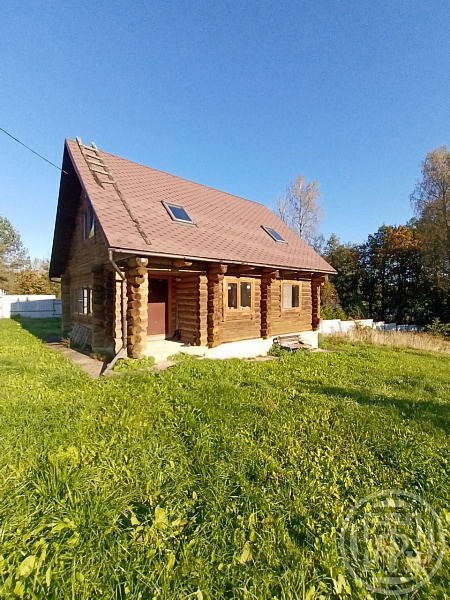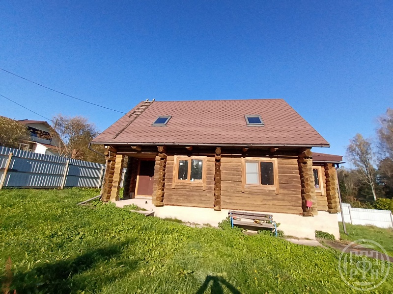 Дом двухэтажный из бревна, фундамент ленточный, крыша мягкая черепица.