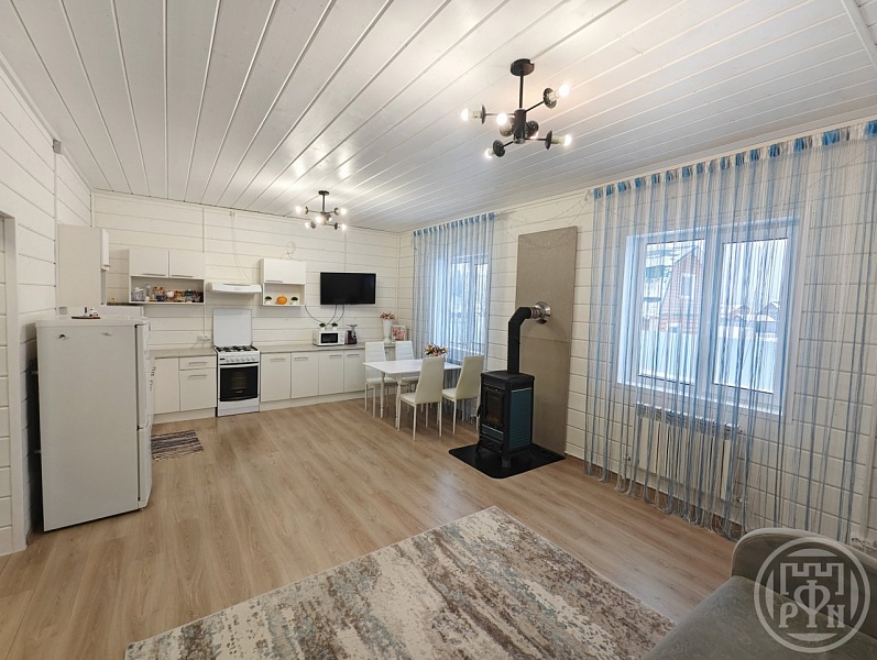 Большая кухня-гостиная позволяет обустроить отдельную зону отдыха и зону готовки, а так-же разместить много гостей на семейные торжества и праздники.