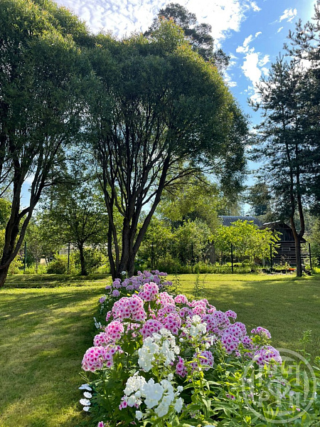 * ухоженный участок с разнообразными постройками и насаждениями;