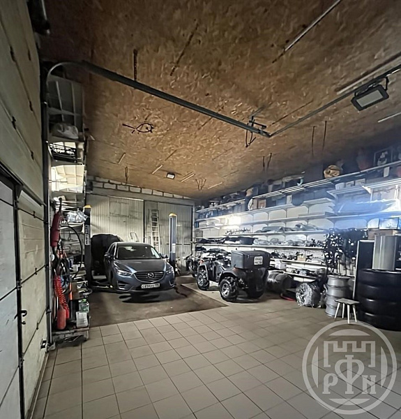 Производственное помещение - база-гараж площадью 120 м2 и потолками 5 метров с возможностью проживания в уютном коттедже на этом же участке.