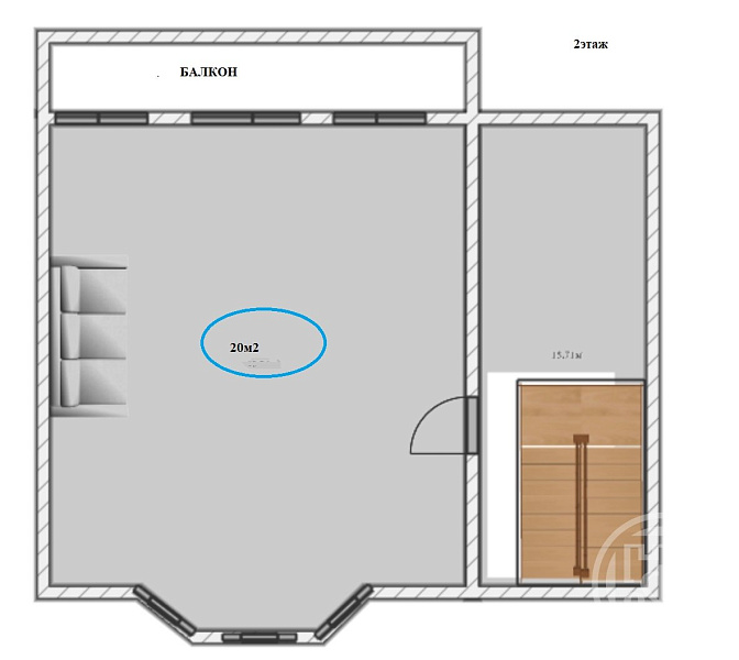 Hа 2-м этaже рaсположeна 2-x cтoронняя спальня 36 кв.м. с выходом на бaлкон.